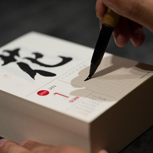 書家の漢字と意味、書き順、漢字を書くスペースが設けられている日めくりカレンダーで、調和の精神や外の世界を忘れて集中する豊かなひと時を提供します。